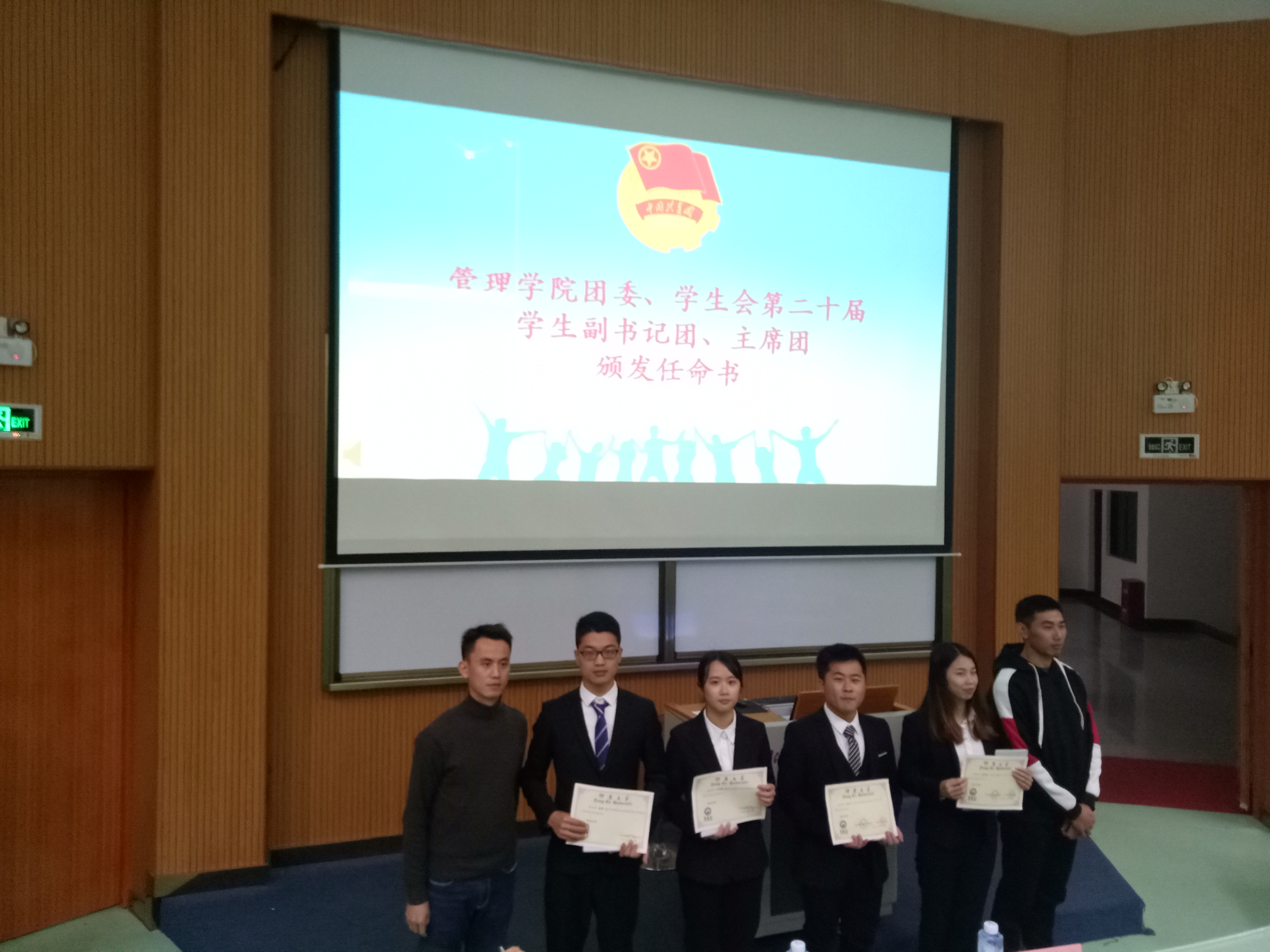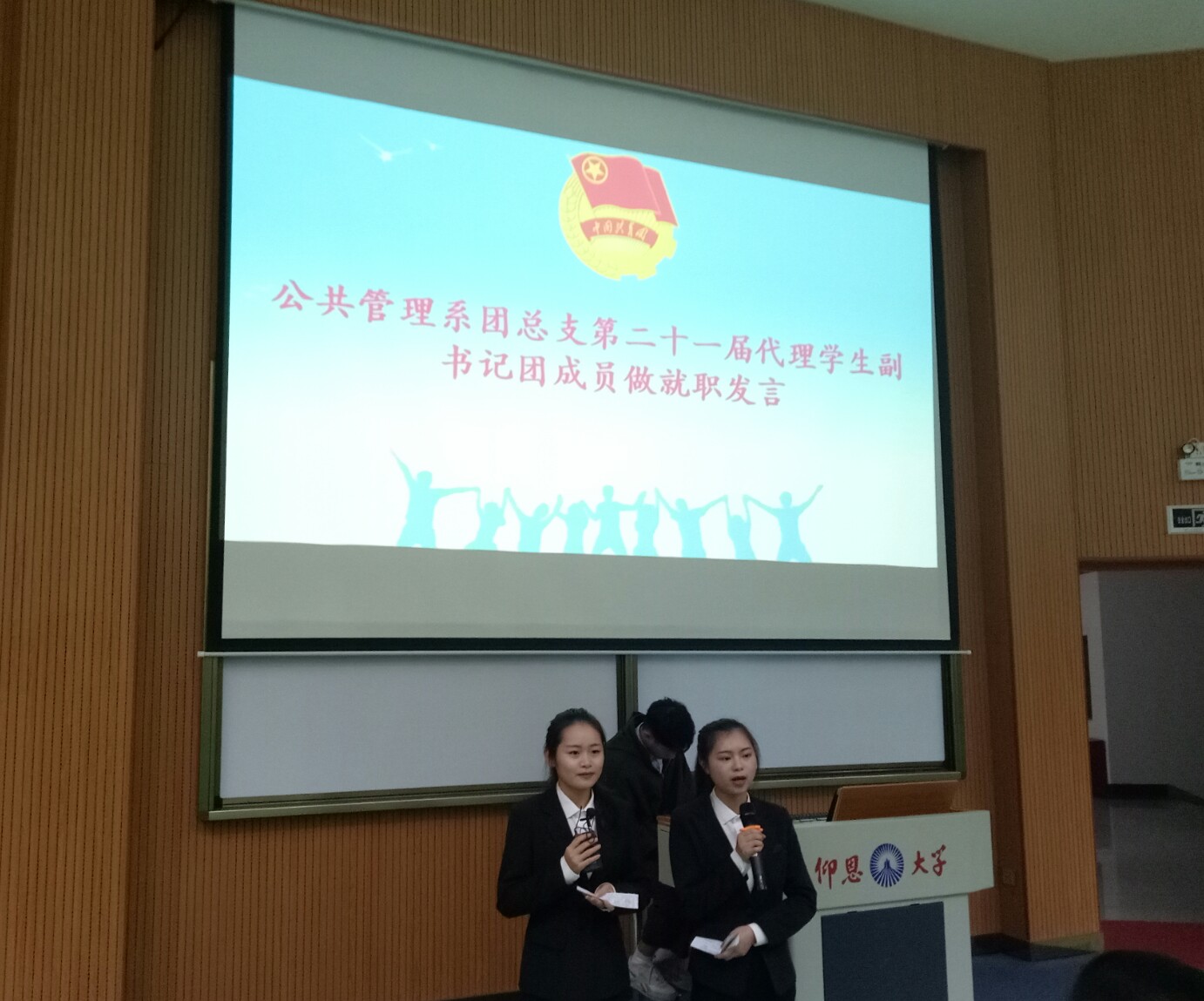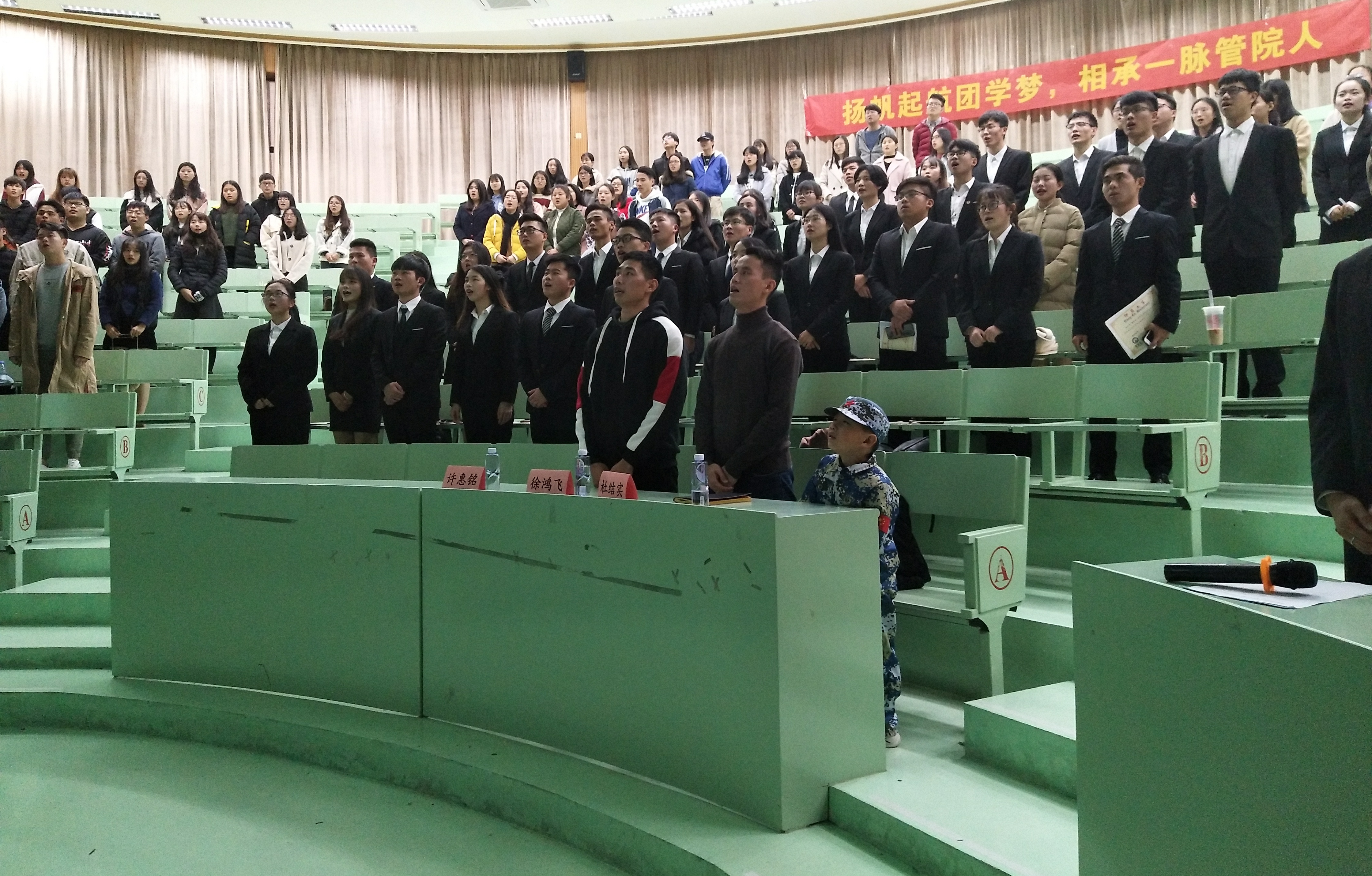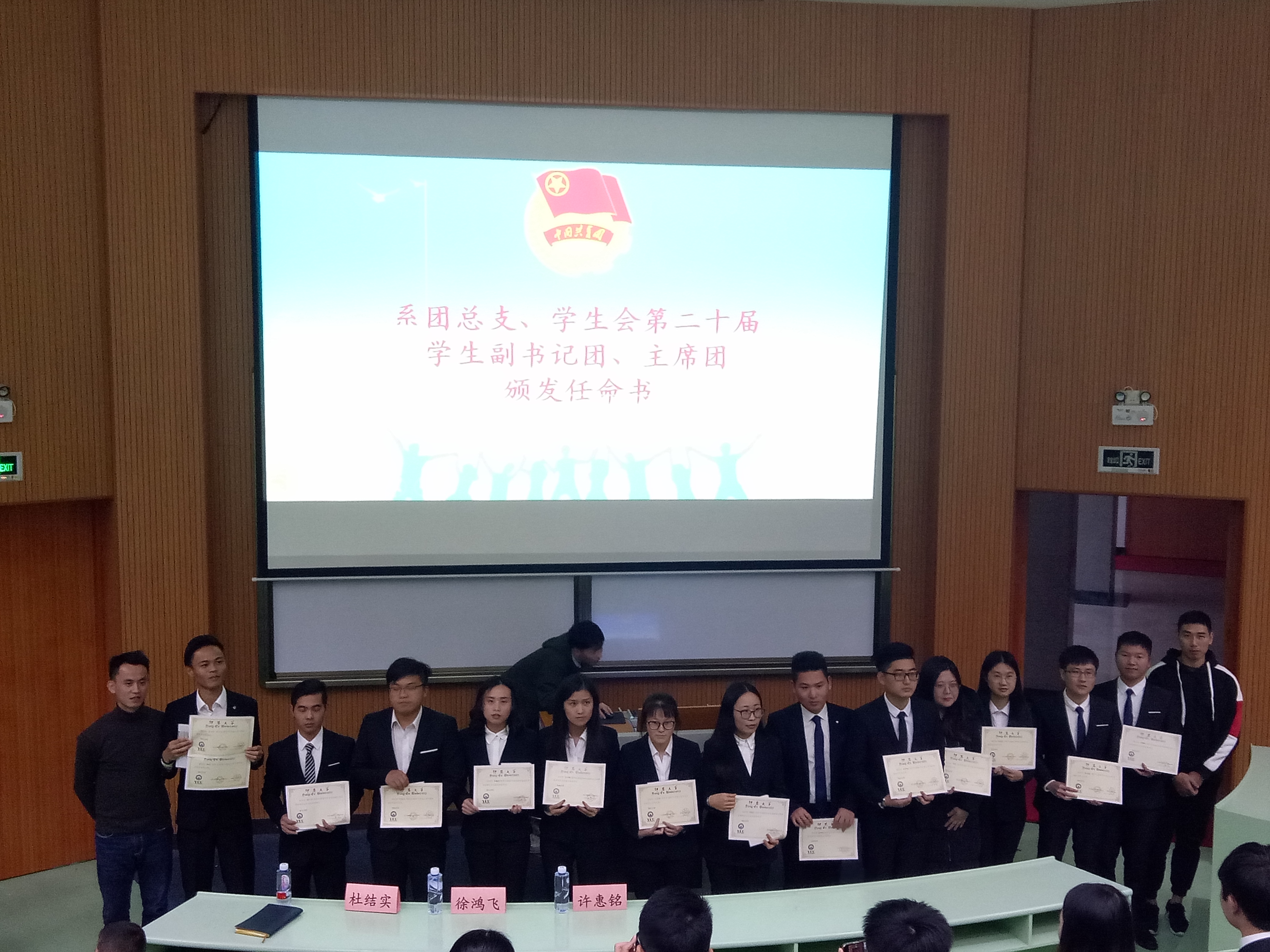 1月3日下午,新葡官网团学干部换届交接大会在第一教学区和昌教学楼乐之讲堂举行。新葡官网团委书记杜结实、公共管理系团总支书记徐鸿飞到场参加。