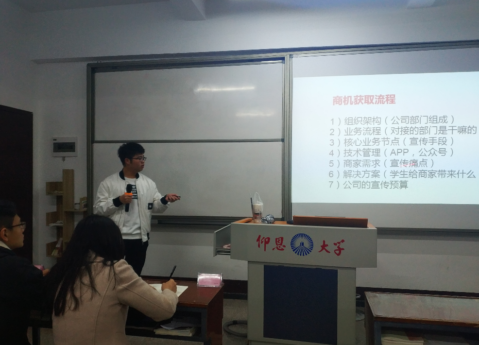 林健鹏同学讲解外联技巧 培训中,林健鹏同学熟练运用PPT,从外联五性、拉赞助流程,以及如何电话拉赞助等方面进行了深入浅出的分析与讲解,其精彩的讲解也赢得了大家的阵阵掌声。不仅如此,现场还进行了模拟拉赞助,让大家深入体会。