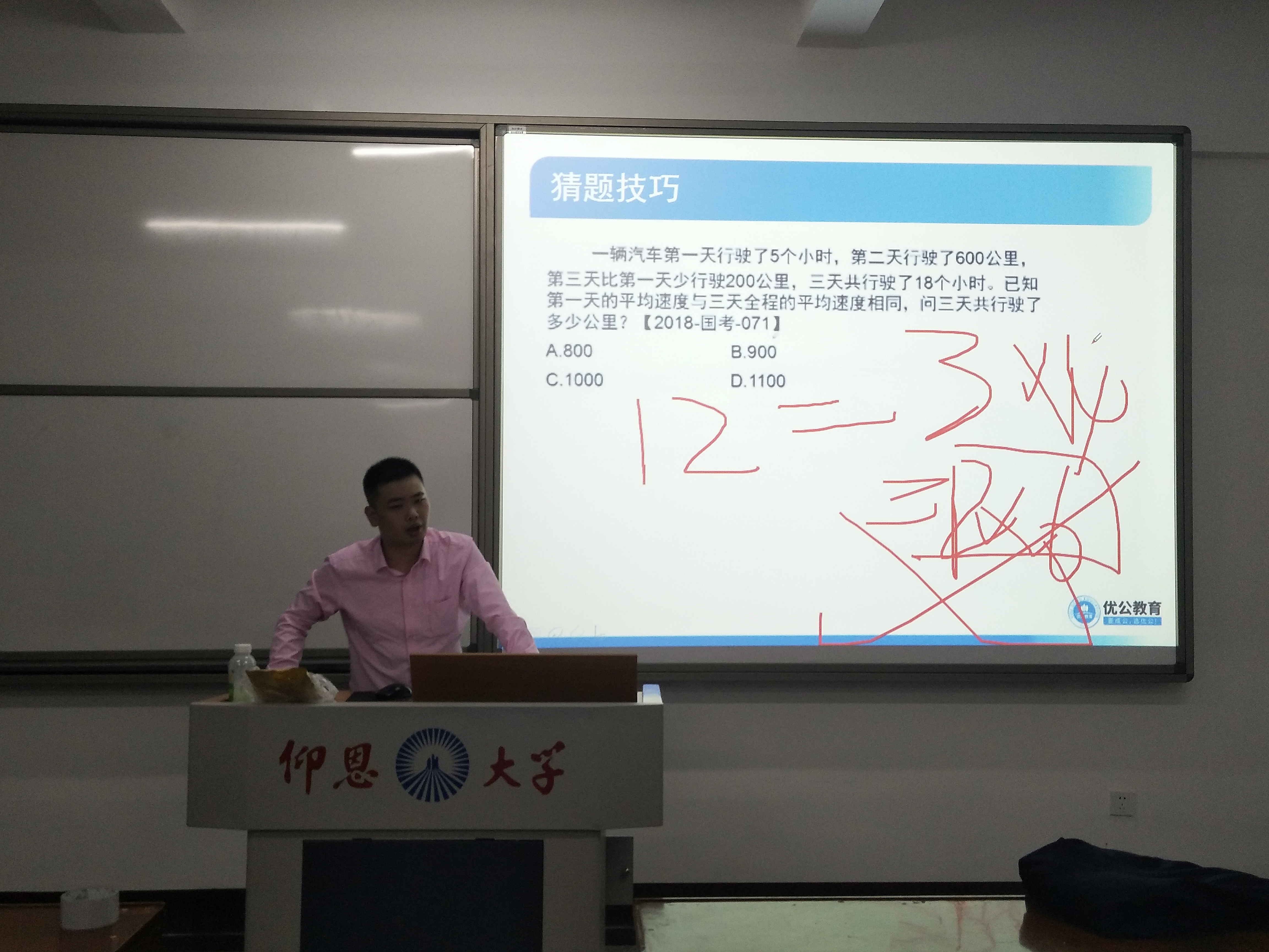 叶秋多角度解析真题 此次公开课的讲师是优公数资名师叶秋,引导式的开篇吸引了大家的注意力,紧接着他向同学们介绍了省考行测备考方法,以及数姿模块高分解题技巧。以公务员考试真题为例,进行答题指导,就如何做出合理性论断、如何结合材料等角度分析问题、如何运用材料得高分等技巧都作了具体示范,使得同学们受益匪浅。