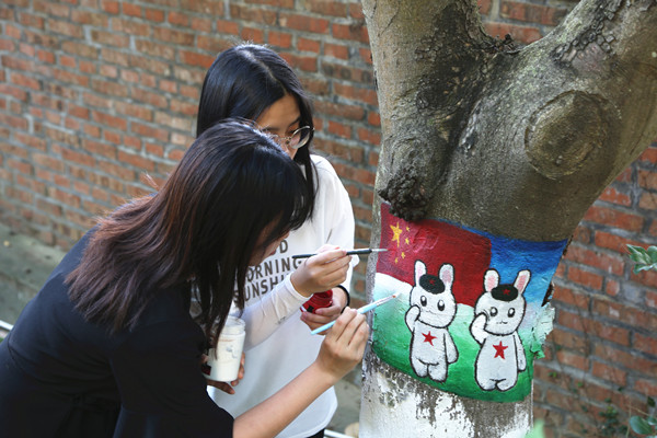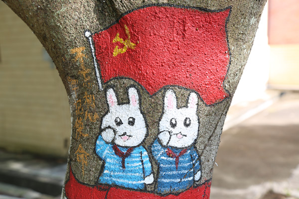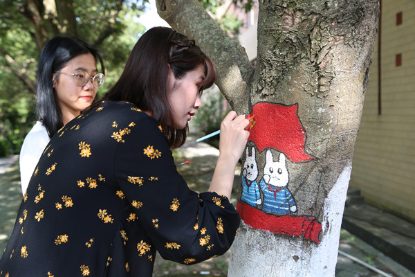 “去年有个学姐在树干画动漫小动物,受了她的影响,我们也想尝试一下爱国主义题材漫画的创作。”3003新葡官方网站陈小丹把这个想法告诉身边的同学,受到了同学们的积极响应,也得到了指导老师的大力支持。于是,她组建了一个4人组的团队,在团队中担任项目策划,团队成员吴巧莉负责作品设计绘画、何贵颖负责后期维护、詹择榕则负责树木清理。
