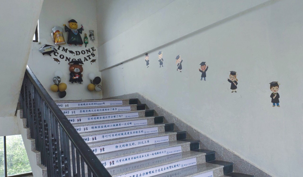 留言墙 回忆走廊展示的内容多样,形式丰富,在每级台阶都张贴了毕业季语录,这些语录都是“那些年”经常与好友挂在嘴边的经典话语。此外,回忆走廊墙上设置了留言板块,毕业生们可留关于仰恩的回忆。场地布置十分精美,引得师生驻足拍照。