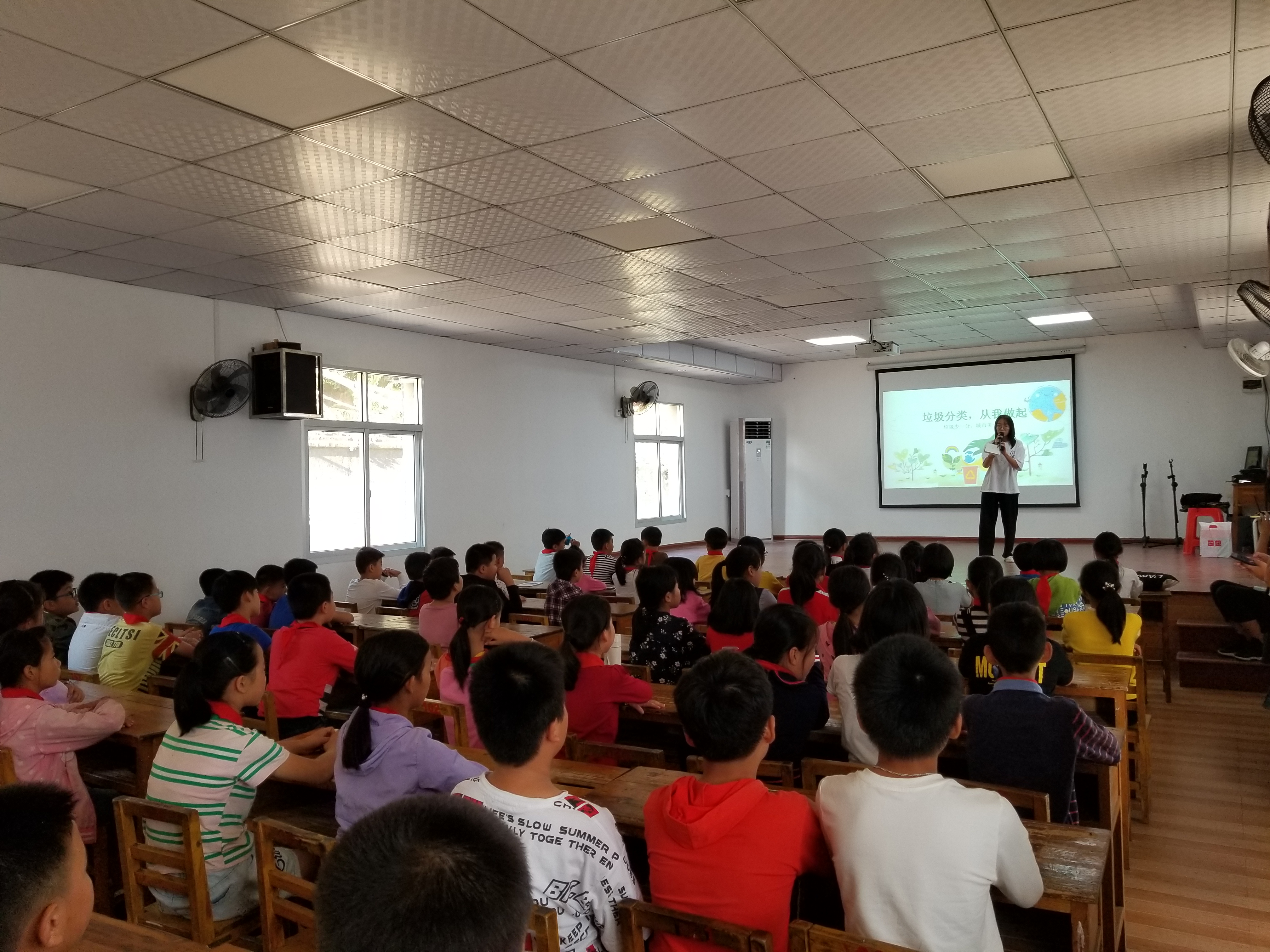 黄晓珍同志介绍垃圾分类的意义 活动由黄晓珍同志主持。活动伊始,黄晓珍同志通过PPT图文向彭殊小学的学生讲解了生活中垃圾分类的意义、生活垃圾分类的模式以及生活垃圾分类的标识等基本知识。接着,张琳同志带来了自制的分类垃圾桶,根据分类垃圾桶的样式为学生详细地介绍了可回收垃圾、有毒有害垃圾、厨余垃圾、其他垃圾。最后,大家就本次活动进行了实践,组织彭殊小学的学生在操场上展开垃圾分类趣味赛,通过游戏的方式来加深大家对于垃圾分类的印象。学生积极参与,对垃圾分类很快有了自己的认识,明白了垃圾不分类投放会导致生态环境恶劣,美丽的家园会被破坏。