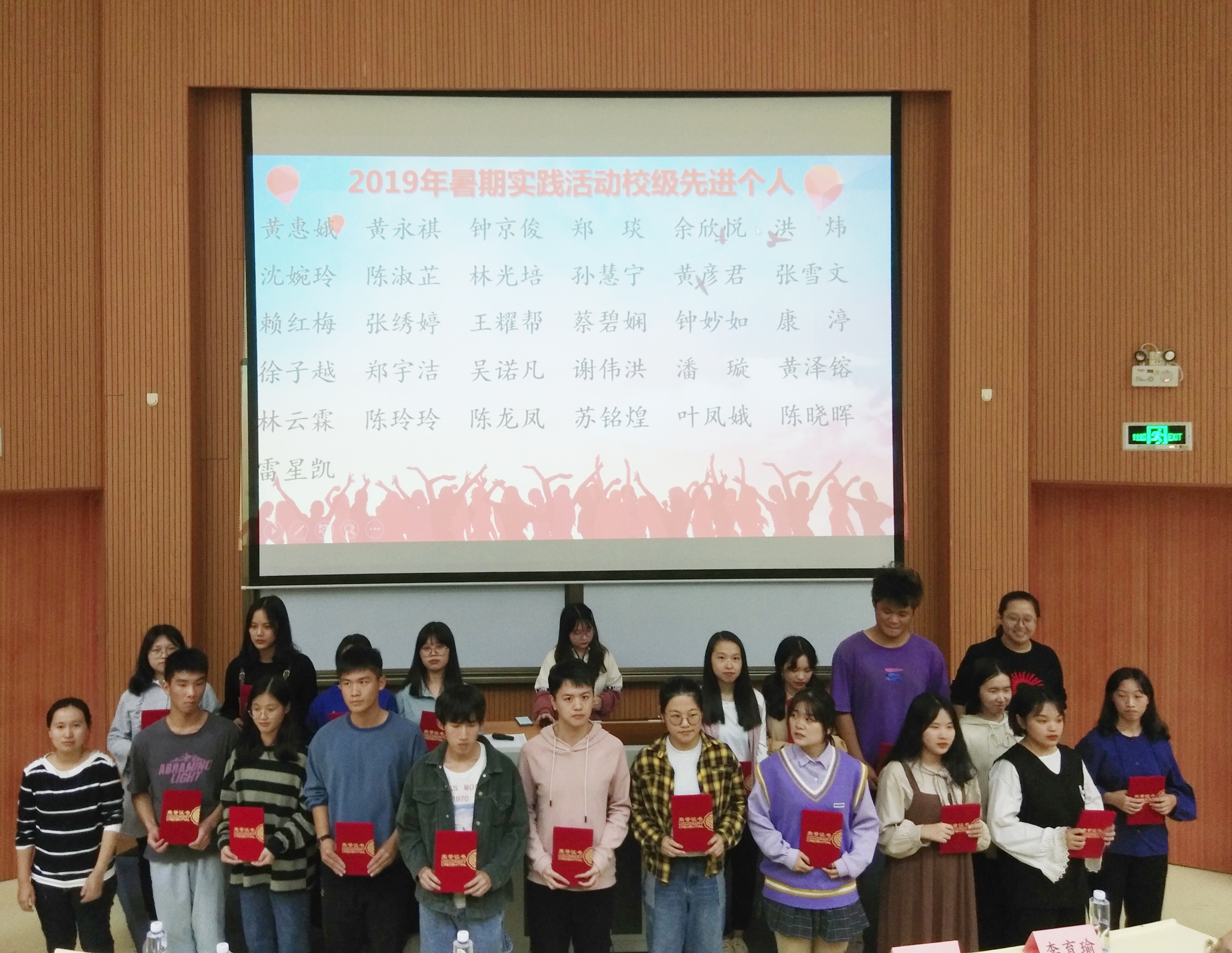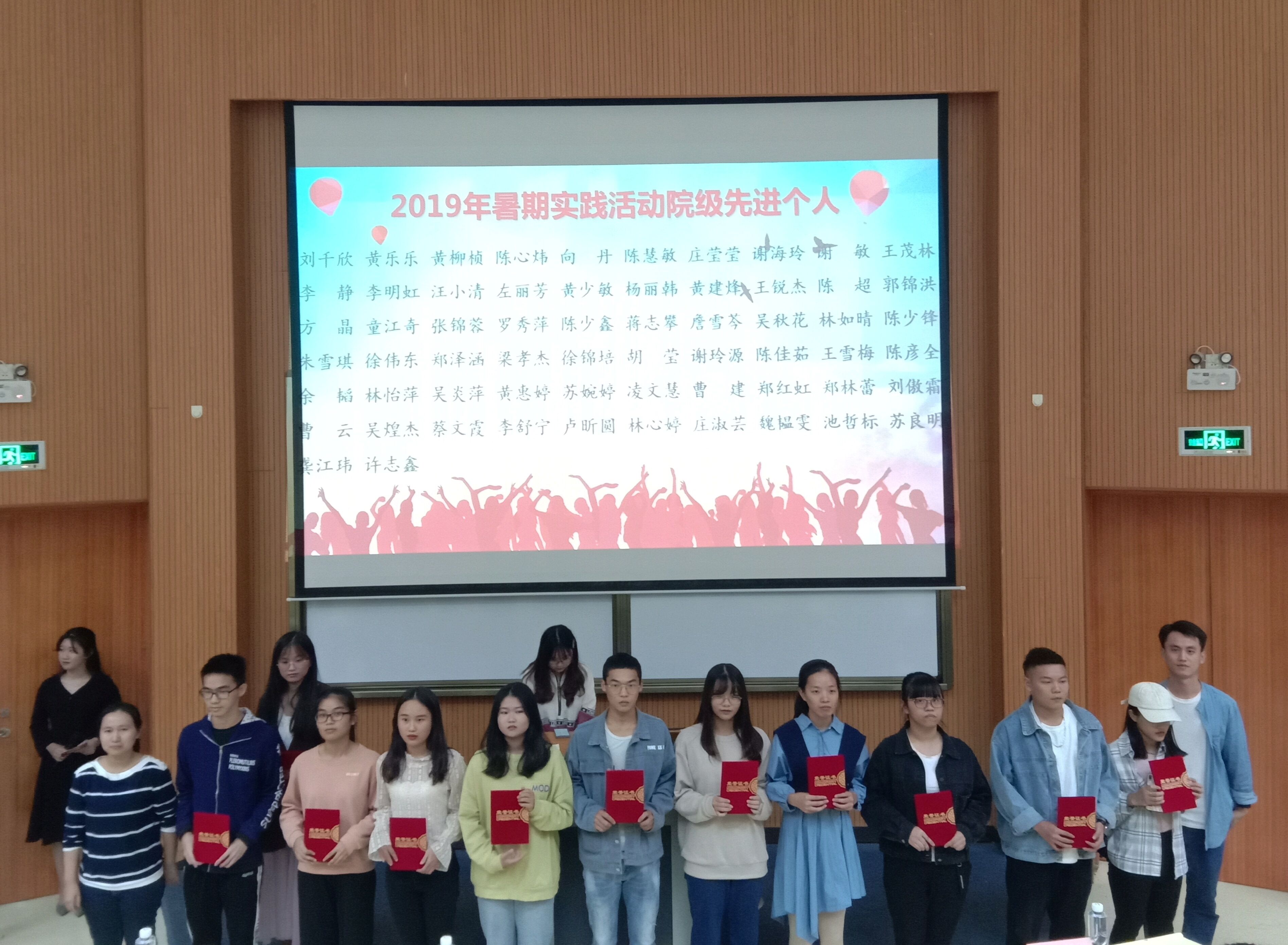 10月31日晚,新葡官网2019年暑期实践活动表彰大会(暨3003新葡官方网站第一届课堂笔记大赛学院复赛表彰大会和2019-2020学年第一期班级黑板报——庆祝新中国成立70周年专题评比表彰大会)在第一教学区和昌教学楼致知讲堂举行。3003新葡官方网站院长翁景德、副院长庄海刚、3003新葡官方网站党总支副书记蔡惠丽、院团委书记杜结实、各系团总支书记出席表彰大会,各实践队指导老师、获奖学生代表以及2019级全体大一新生参加表彰大会。