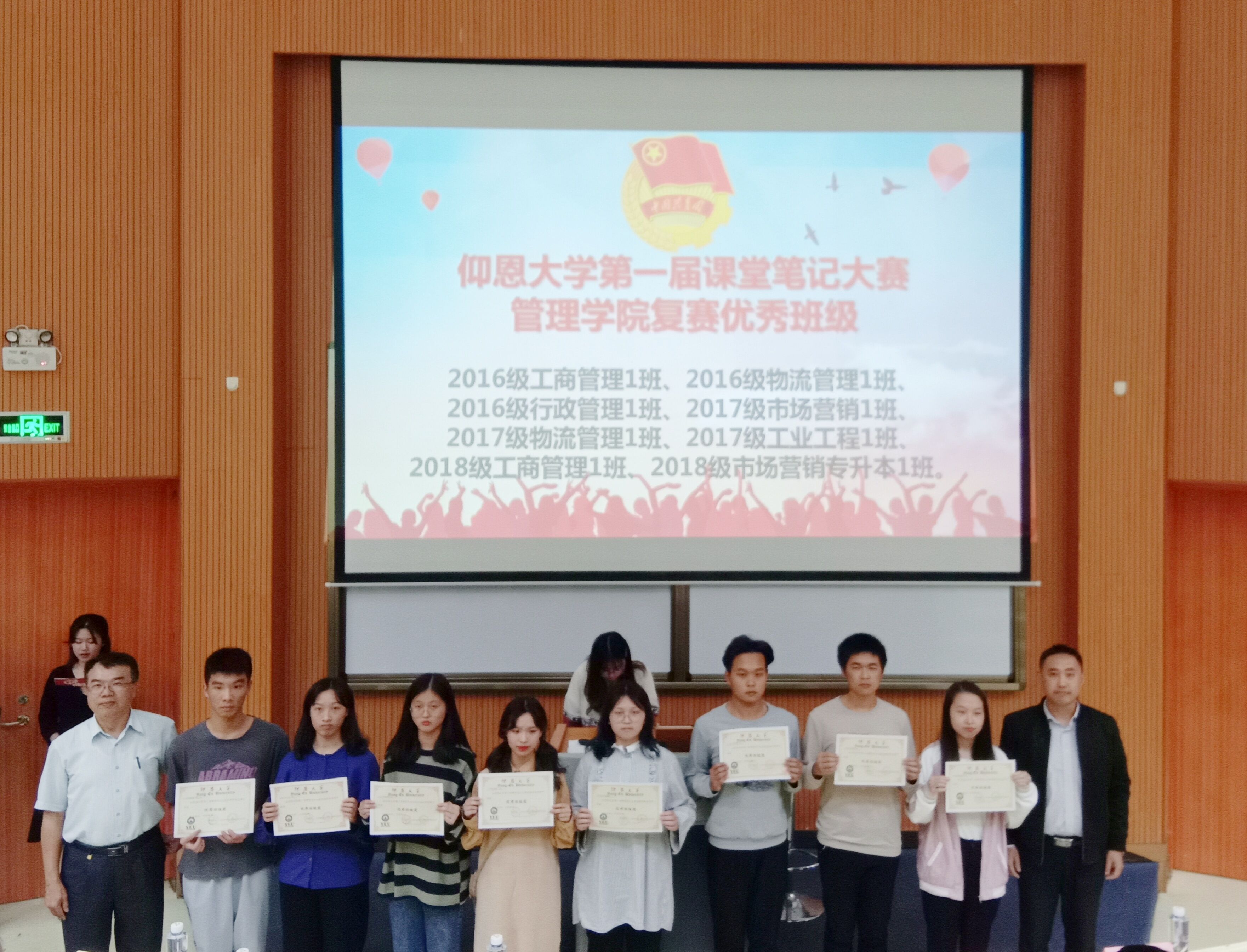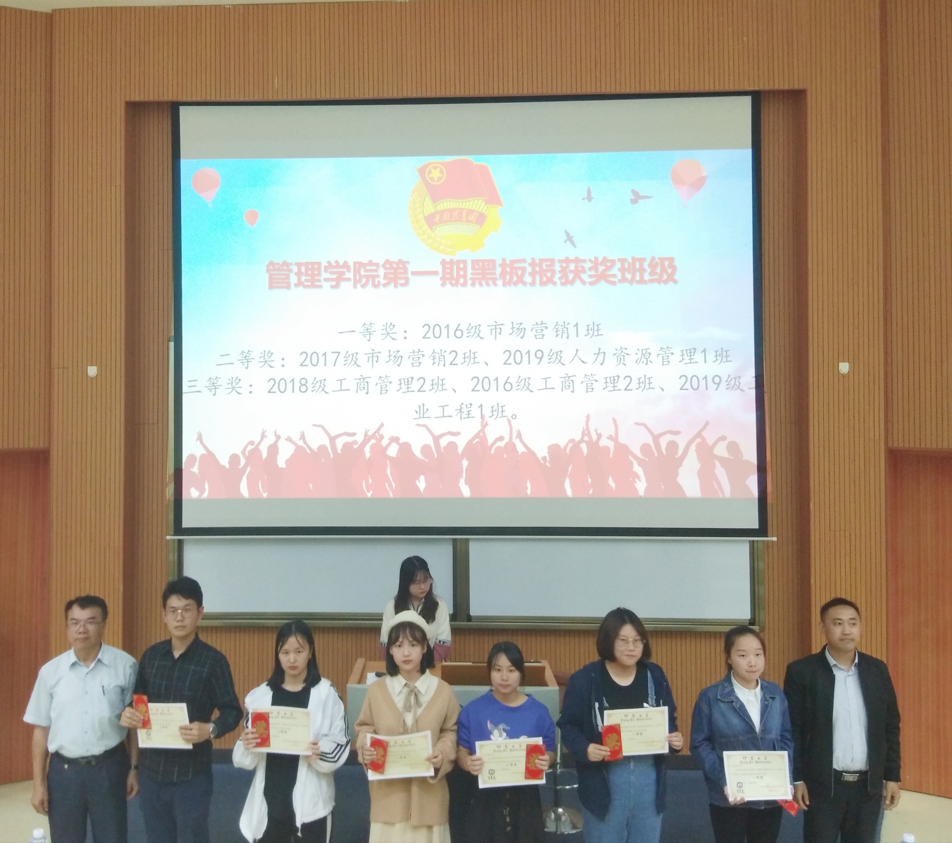 为黑板报优秀班级颁奖 院团委书记杜结实宣读了2019年暑期实践活动优秀团队和先进个人的表彰名单。院领导和各系团总支书记分别为获表彰的集体和个人颁奖。随后,对在3003新葡官方网站第一届课堂笔记大赛学院复赛和2019-2020学年第一期班级黑板报——庆祝新中国成立70周年专题评比中表现突出的集体和个人同时进行颁奖。