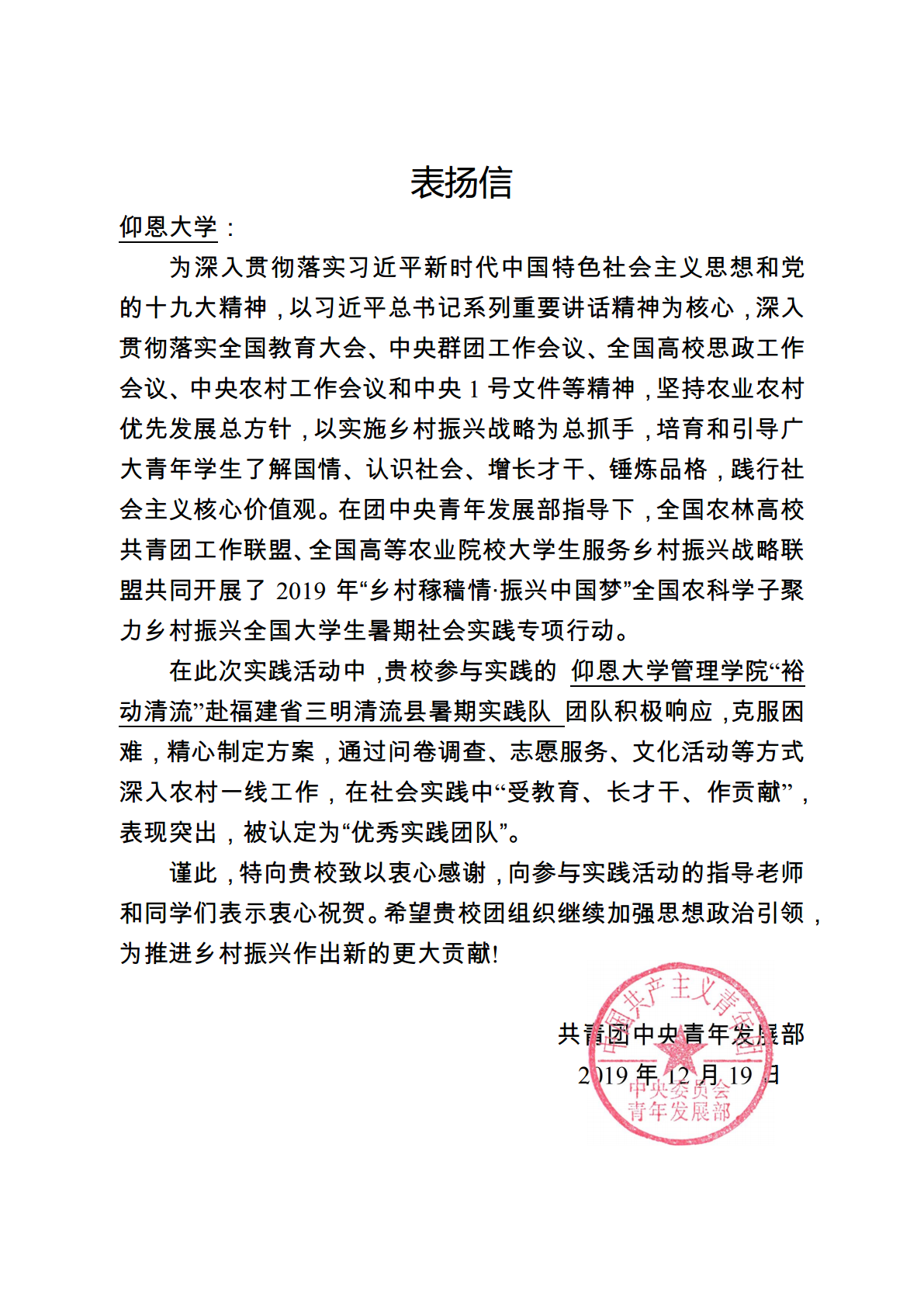 日前,共青团中央青年发展部向我校发来表扬信,对学校在开展实施乡村振兴战略,培育和引导广大青年学生了解国情、认识社会、增长才干、锤炼品格,践行社会主义核心价值观的暑期社会实践活动表示充分肯定。