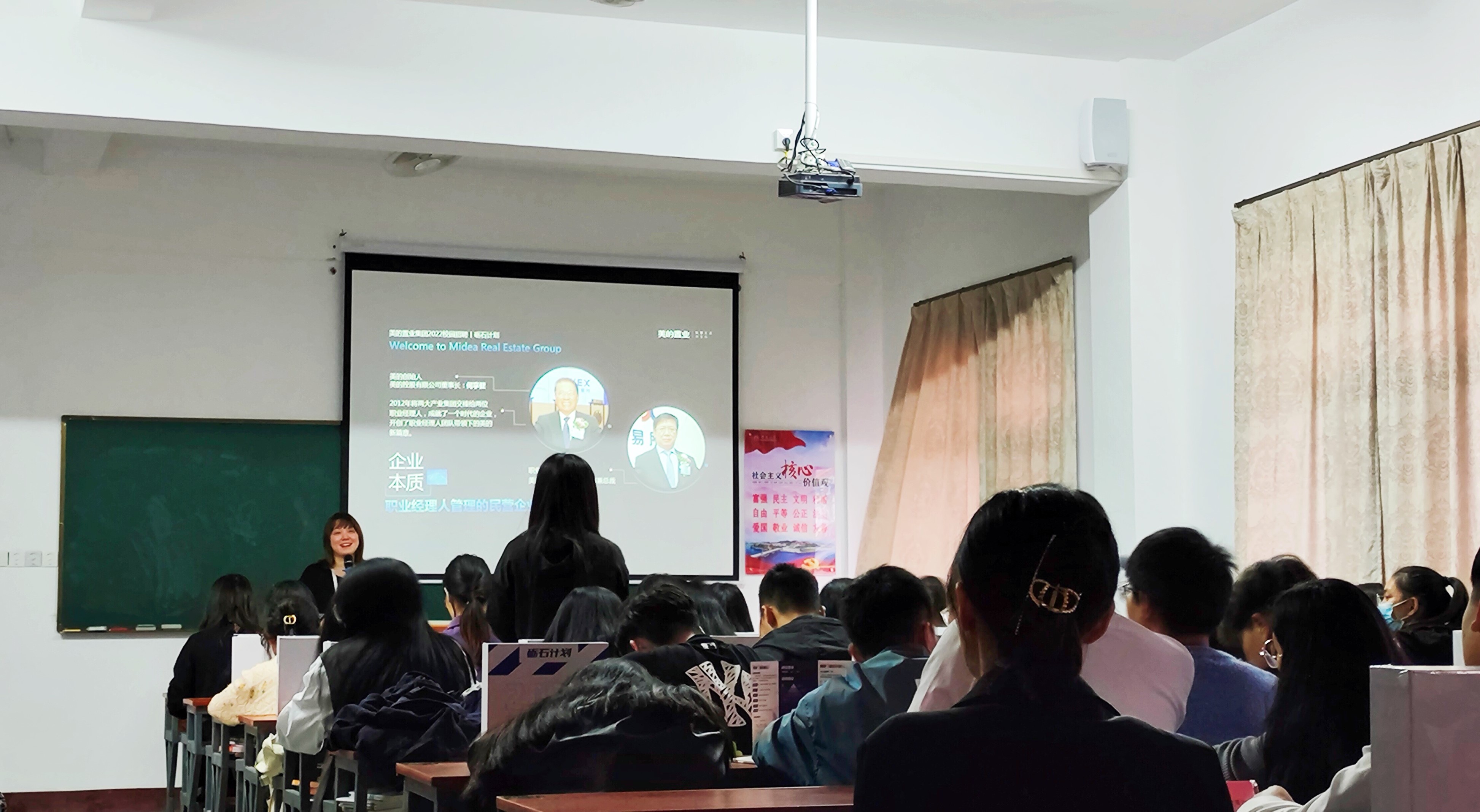负责人张晓蕾介绍集团相关内容 本次宣讲会首先由该集团的张晓蕾向同学们放映美的置业集团的视频宣传片,展示了该集团自建立以来,秉持着“开放、和谐、务实、创新”的精神。并且,就该集团目前所拥有的资质,所获奖项,以及之前承建的各个项目等企业历史一一向同学们做了详细的介绍。接着就是在该集团就职的两位学姐就个人的经验以及感悟给同学们进行了简单的分享。在宣讲会结束前,该负责人给现场同学进行了一个简短的答疑交流环节。同学们就职业发展、晋升道路、薪资待遇等进行踊跃提问。负责人给每位提出问题的同学都给予了详细的回答并给出建议。宣讲结束后,各位同学也对美的置业集团的各项信息和求职前景有一定的了解。有意愿的同学纷纷参与了美的置业集团的面试。