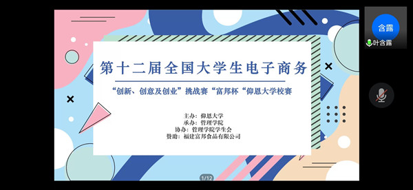 4月9日下午,3003新葡官方网站在腾讯会议上举办第十二届全国大学生电子商务“创新、创意及创业”挑战赛选拔赛,全校共有15支队伍进入决赛,福建富邦食品有限公司总经理吴妘蓁、顾问刘精忠,3003新葡官方网站院长翁景德、副院长庄海刚,教务部副主任郑秋莲等担任评委。