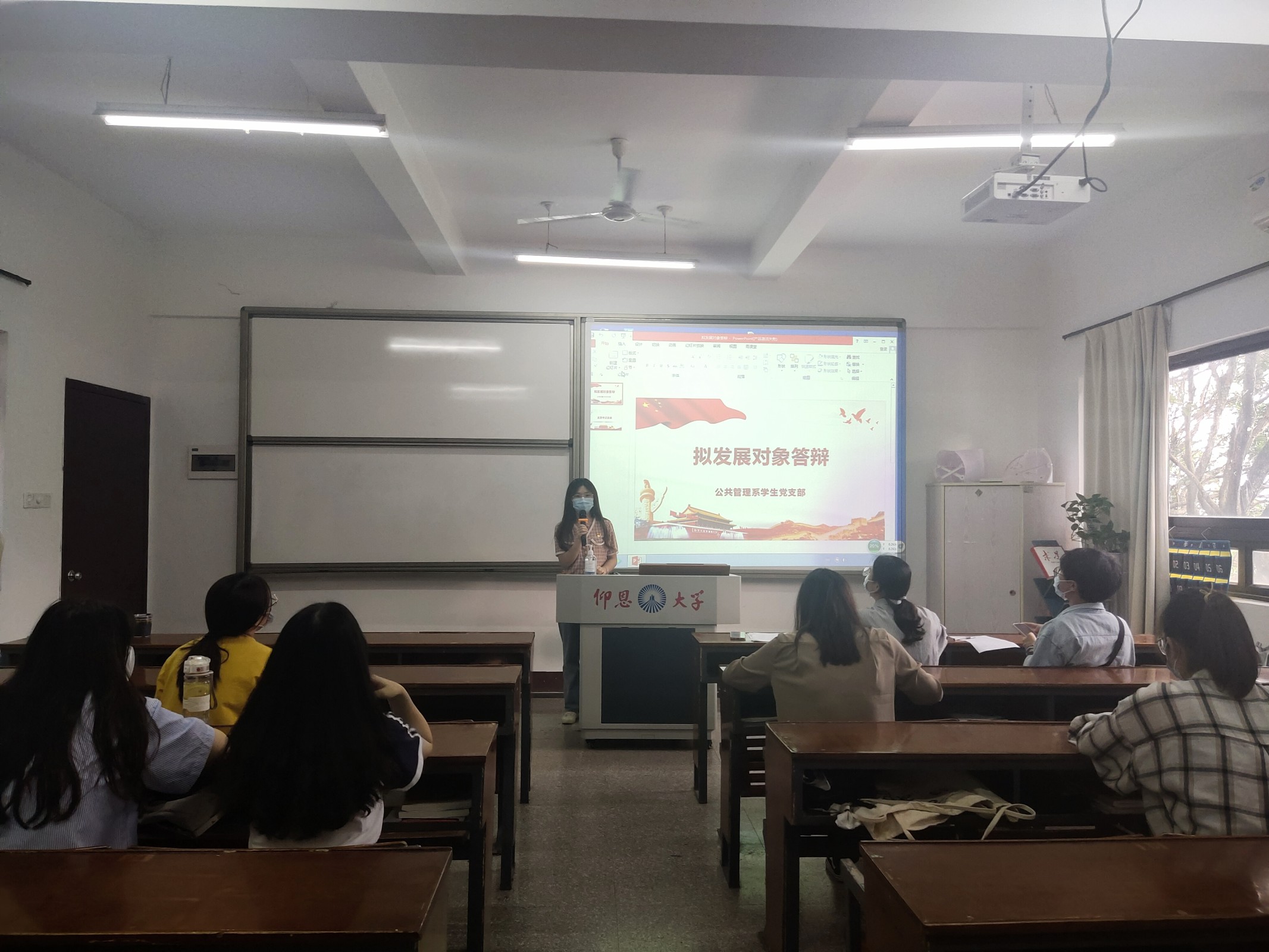 拟发展对象发言 本次答辩以集体评议方式进行。在答辩过程中,拟发展对象通过PPT展示,围绕自我介绍、对党的认识、入党动机、现实表现,以及自己所参加的实践活动和对自己的未来展望等方面进行讲解。随后,支部书记、党总支宣传委员、支部支委对答辩对象进行提问,主要涉及党的理论知识、时事政治和个人学习规划等方面,同时也对答辩对象在演讲环节中存在问题给出了意见和建议。最后,支部书记叶丽香对本次答辩会进行总结,她希望各位拟发展对象能够不忘自己的入党初心,进一步加强理论知识学习,提高个人修养,成为合格的共产主义接班人。