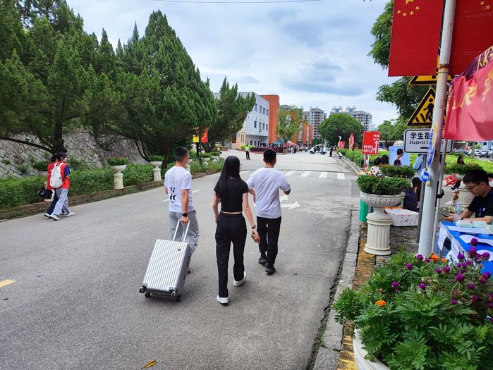 迎新接待点设在普照大礼堂前的空地。随着新生们陆陆续续的到来,党员同志迅速帮助新同学把行李寄存好,有条不紊地引领新生完成报到的相关程序。报到过程虽然简单,但其中不乏有语言差异等问题,在党员同志的细心帮助下,真正做到了:沟通零距离。