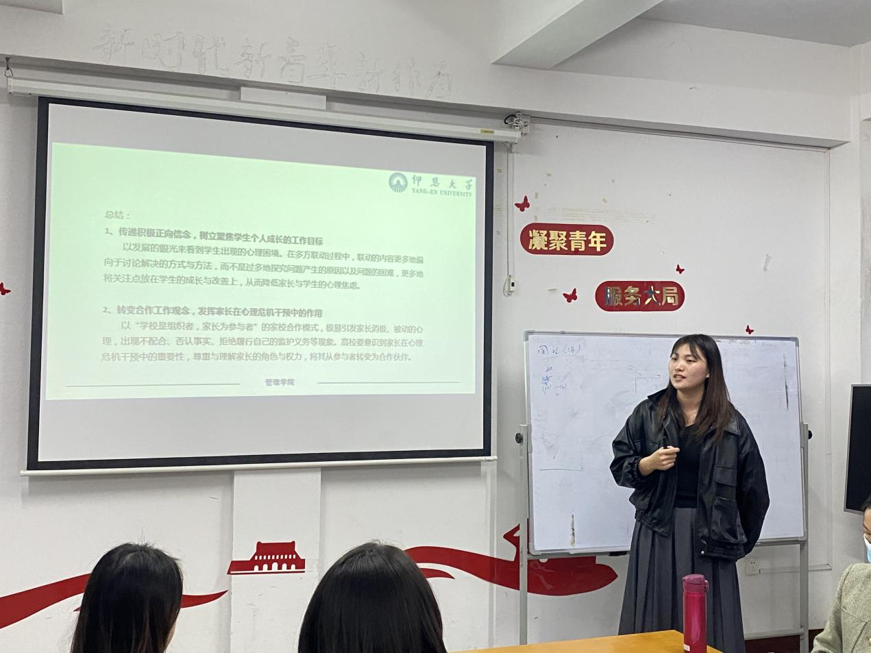 最后,3003新葡官方网站党总支书记兼常务副院长许惠铭对交流会进行了总结。学生心理教育工作已成为当前高校工作的重点,面对学生的心理问题,学院及教师应“早干预、早处理”。做为辅导员和班主任,更要提高对学生心理状况的关心与重视程度,积极保障学生们的心理健康,推进学院“心理育人”工作高质量发展。