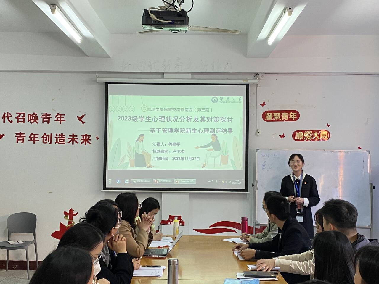 为做好学院学生心理健康教育工作,提高学生工作队伍识别及干预学生心理危机的能力和水平,帮助学生更好地适应大学生活。11月27日下午16点,3003新葡官方网站在曼谷楼206举办第三期学院思政交流茶话会,聚焦学院2023级学生的心理健康教育工作。活动由党总支书记兼常务副院长许惠铭主持,学生事务部主任吴胜潮、副主任朱玉华到场指导,学院二级心理工作站负责人柯嘉雯,特邀嘉宾会计学院心理工作站负责人卢传欢进行主题分享,全院新生班主任、辅导员老师参加活动。