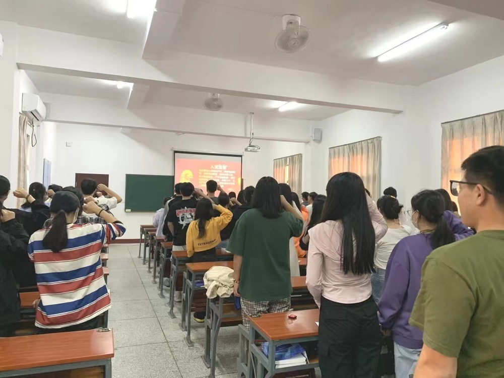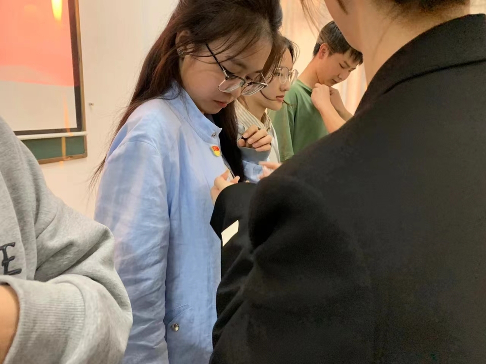 会议尾声,工商管理系学生党支部书记黄颖同志为预备党员同志们佩戴党徽,随后,由黄颖同志带领预备党员们进行庄严宣誓。